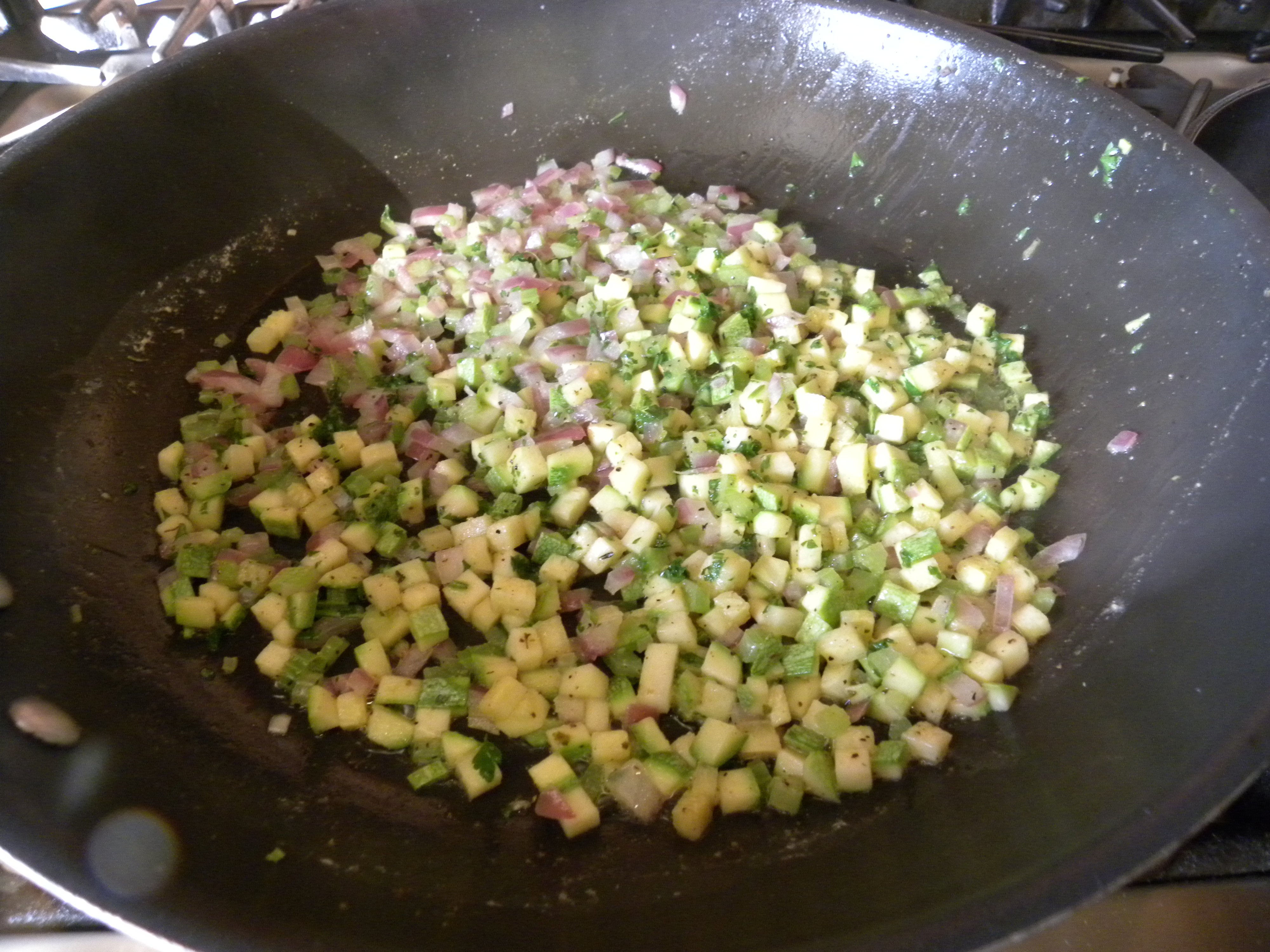 Heat pan and add celery, red onion, zucchini and parsley and saute on high heat for 3-5 minutes.